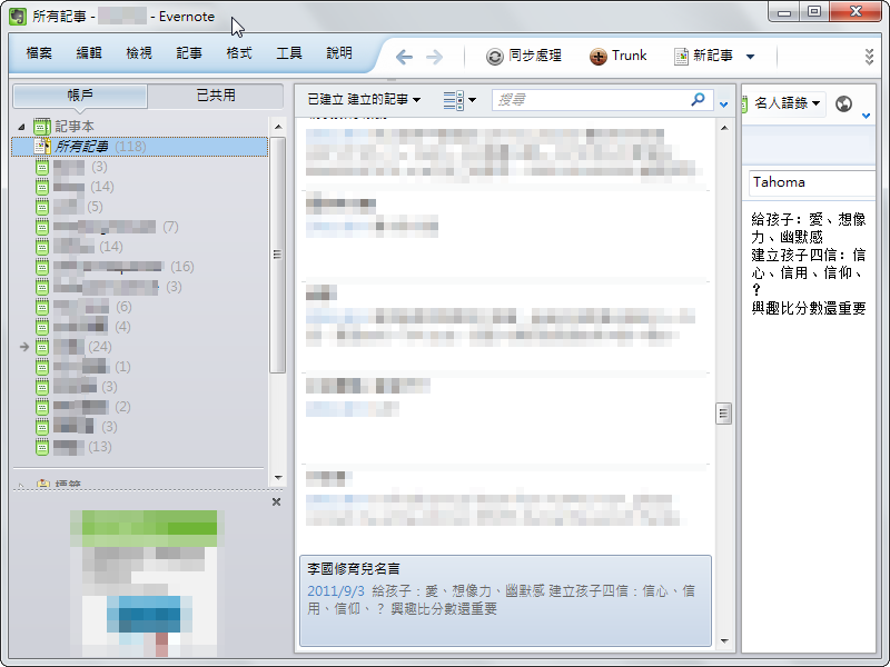 [軟體簡介]:取代Google筆記本 - EverNote,可以即時同步多設備的記事本,當你寫下一筆記事之後,可以自動同步到電腦、雲端、手機(iPhone、Android),除了一般記事外,還有手寫、音訊、網路相機記事,新增待辦事項,最美妙的功能是可以直接貼上網頁內容而圖片卻可以正常顯示,因為它會自動將圖片上專屬伺服器,免費版有些許的功能限制。